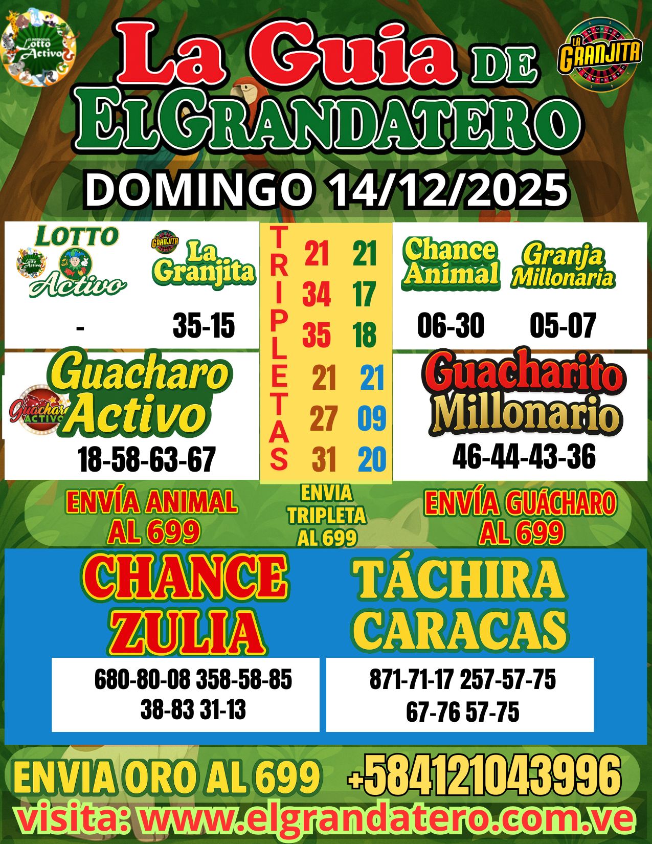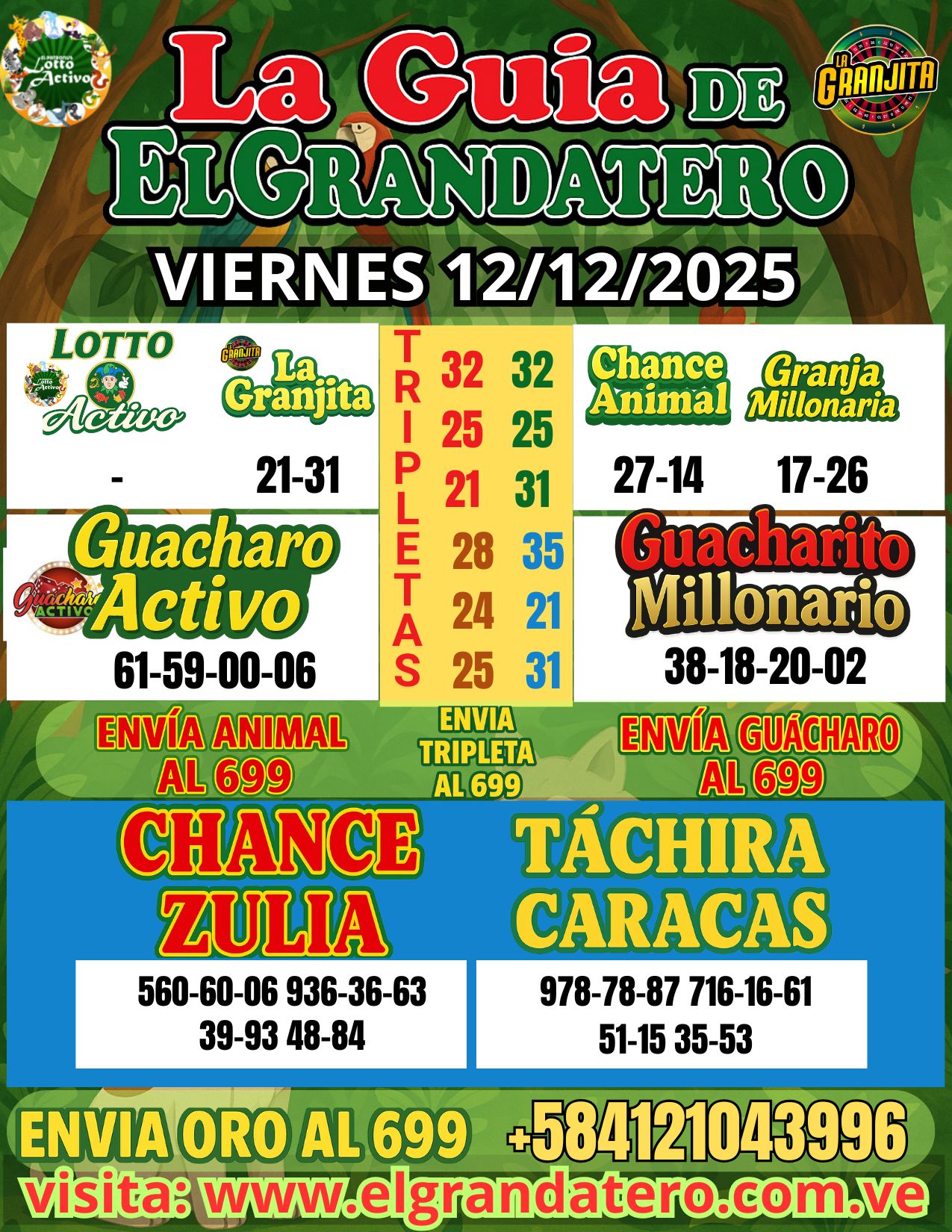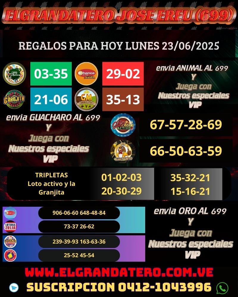 Descubre los mejores datos de loterías gratis para jugar en Chance, Zulia, Táchira y Caracas. Actualizamos nuestras proyecciones diariamente para ofrecerte la mayor precisión y efectividad en tus jugadas. Encuentra aquí datos de animalitos de hoy y resultados en tiempo real de Loto Activo, La Granjita, Chance Animal, Granja Millonaria, Guácharo Activo y Guacharito Millonario. Si buscas datos confiables para loterías venezolanas, estás en el lugar correcto. ¡Juega con estrategia, juega informado!