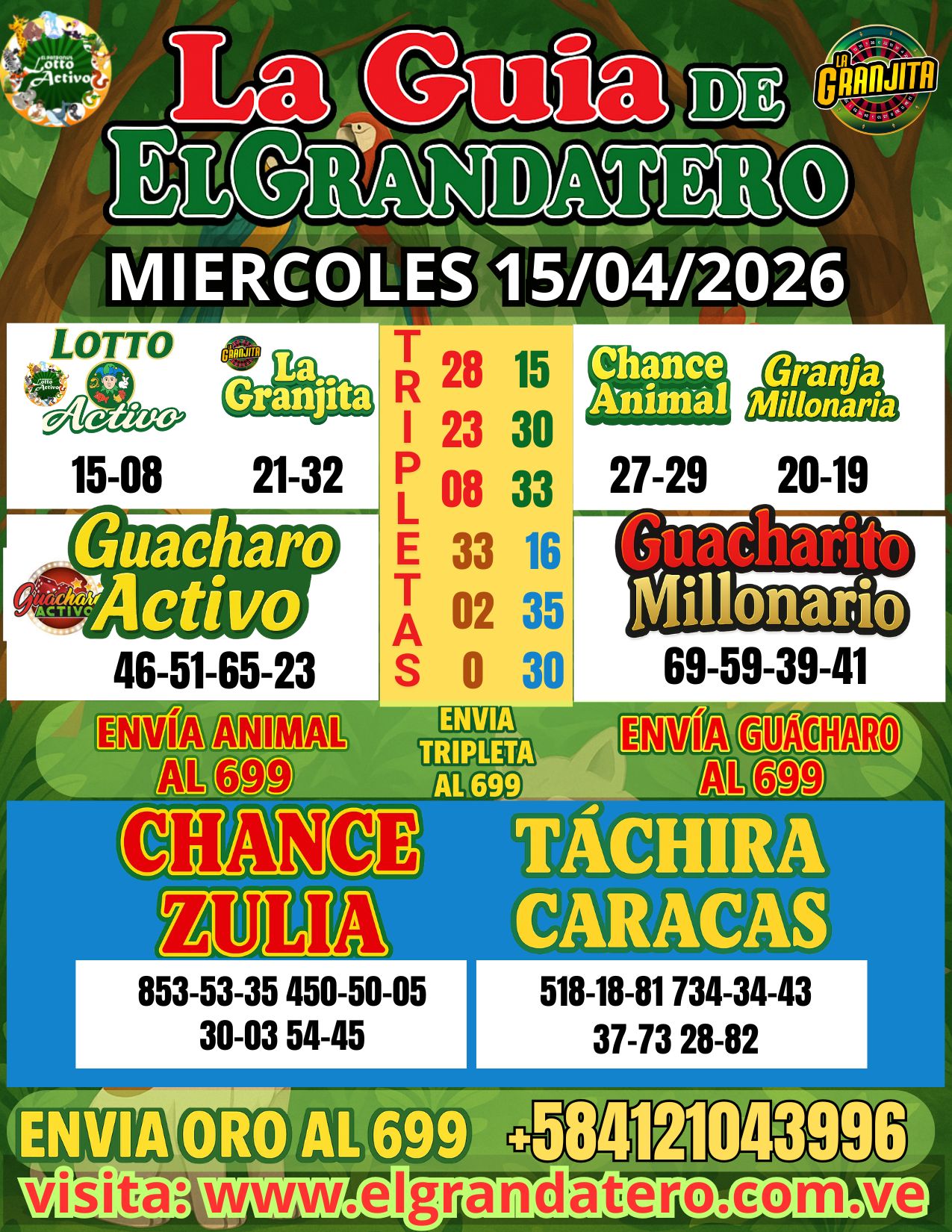 Descubre los mejores datos de loterías gratis para jugar en Chance, Zulia, Táchira y Caracas. Actualizamos nuestras proyecciones diariamente para ofrecerte la mayor precisión y efectividad en tus jugadas. Encuentra aquí datos de animalitos de hoy y resultados en tiempo real de Loto Activo, La Granjita, Chance Animal, Granja Millonaria, Guácharo Activo y Guacharito Millonario. Si buscas datos confiables para loterías venezolanas, estás en el lugar correcto. ¡Juega con estrategia, juega informado!...