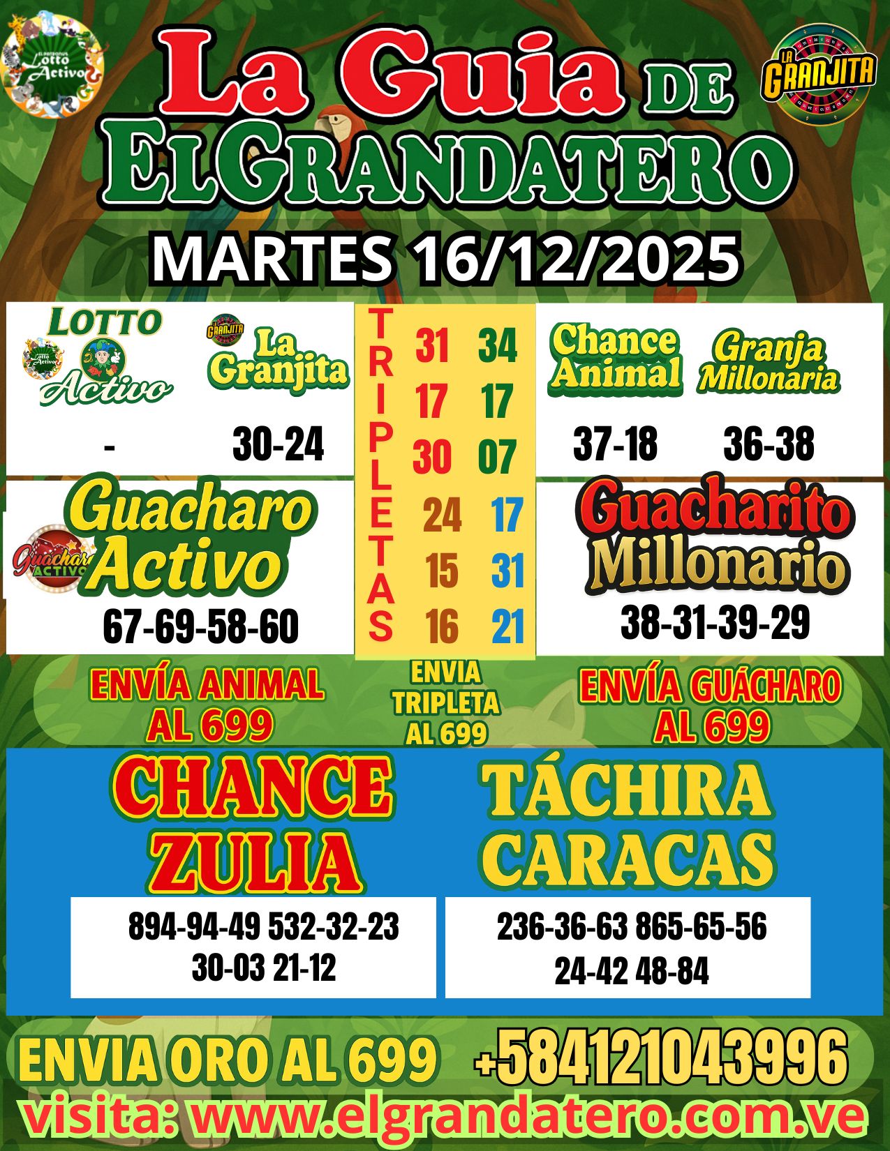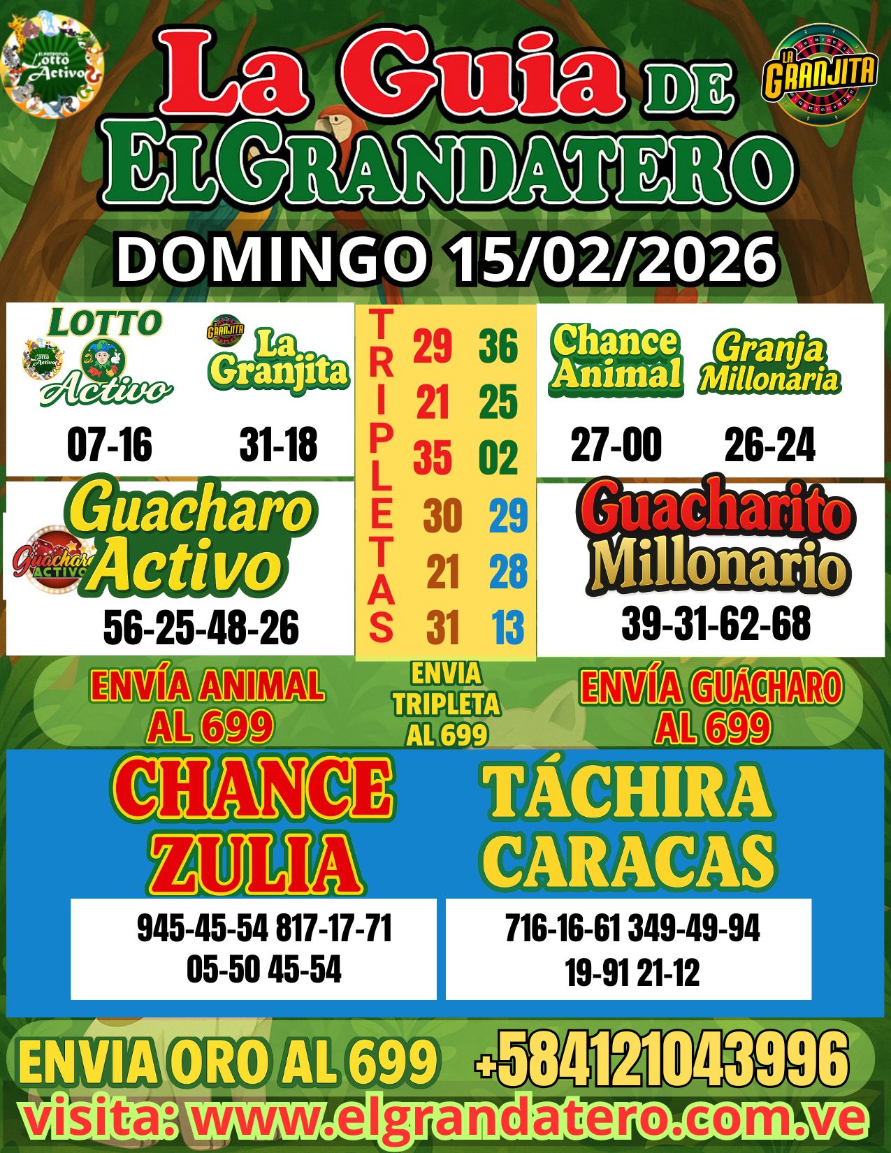 Descubre los mejores datos de loterías gratis para jugar en Chance, Zulia, Táchira y Caracas. Actualizamos nuestras proyecciones diariamente para ofrecerte la mayor precisión y efectividad en tus jugadas. Encuentra aquí datos de animalitos de hoy y resultados en tiempo real de Loto Activo, La Granjita, Chance Animal, Granja Millonaria, Guácharo Activo y Guacharito Millonario. Si buscas datos confiables para loterías venezolanas, estás en el lugar correcto. ¡Juega con estrategia, juega informado!
