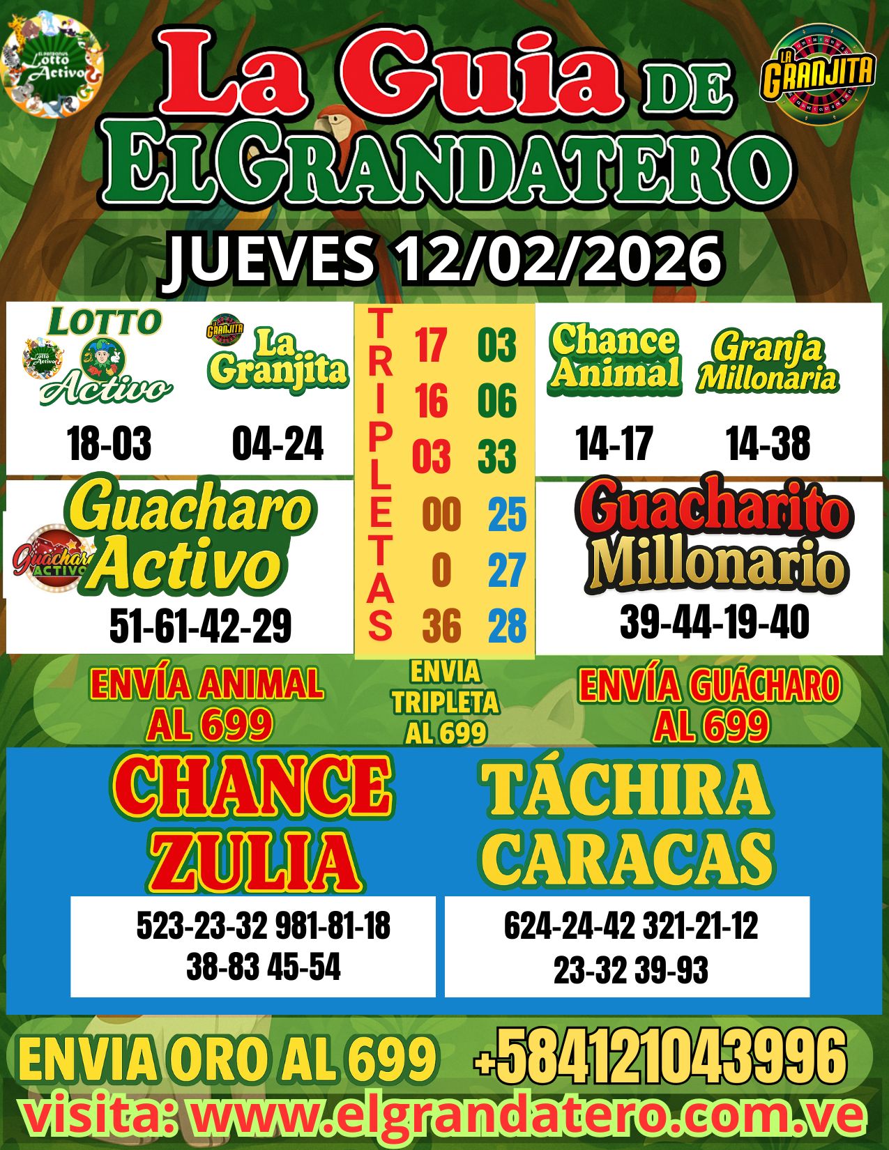Descubre los mejores datos de loterías gratis para jugar en Chance, Zulia, Táchira y Caracas. Actualizamos nuestras proyecciones diariamente para ofrecerte la mayor precisión y efectividad en tus jugadas. Encuentra aquí datos de animalitos de hoy y resultados en tiempo real de Loto Activo, La Granjita, Chance Animal, Granja Millonaria, Guácharo Activo y Guacharito Millonario. Si buscas datos confiables para loterías venezolanas, estás en el lugar correcto. ¡Juega con estrategia, juega informado!