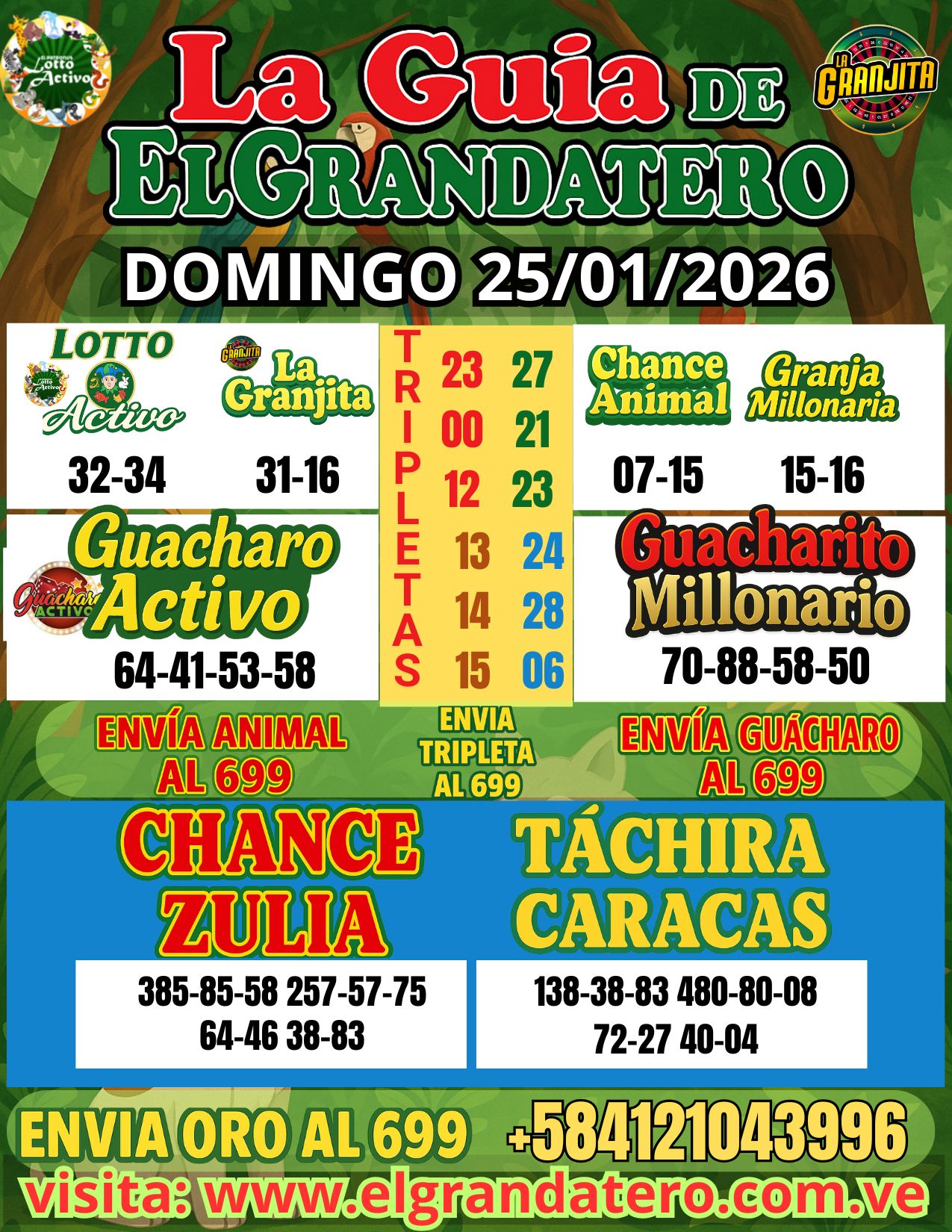 24/01 | 12:16 @elgrandatero [0412-104-3996] : Buenos dias Feliz y bendecido dia, ayer 2 triple y 659 directo hoy SABADO seguimos la fiesta envia ORO AL 699 Y GUACHARO AL 699