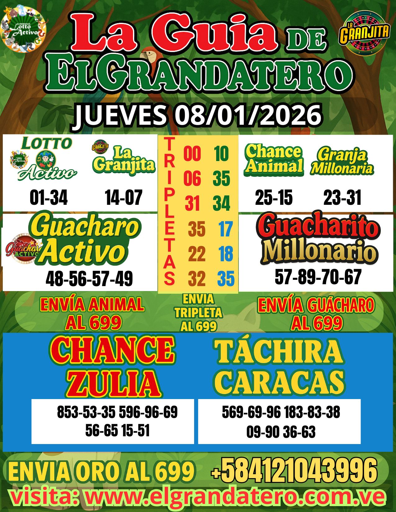 08/01 | 07:57 @ELGRANDATERO [0412-104-3996] : Feliz y bendecido día JUEVES con la mejor actitud, ayer cobramos con el 879 en zulia de la tarde hoy vamos por mas envia ORO AL 699 y ANIMAL AL 699 consigan