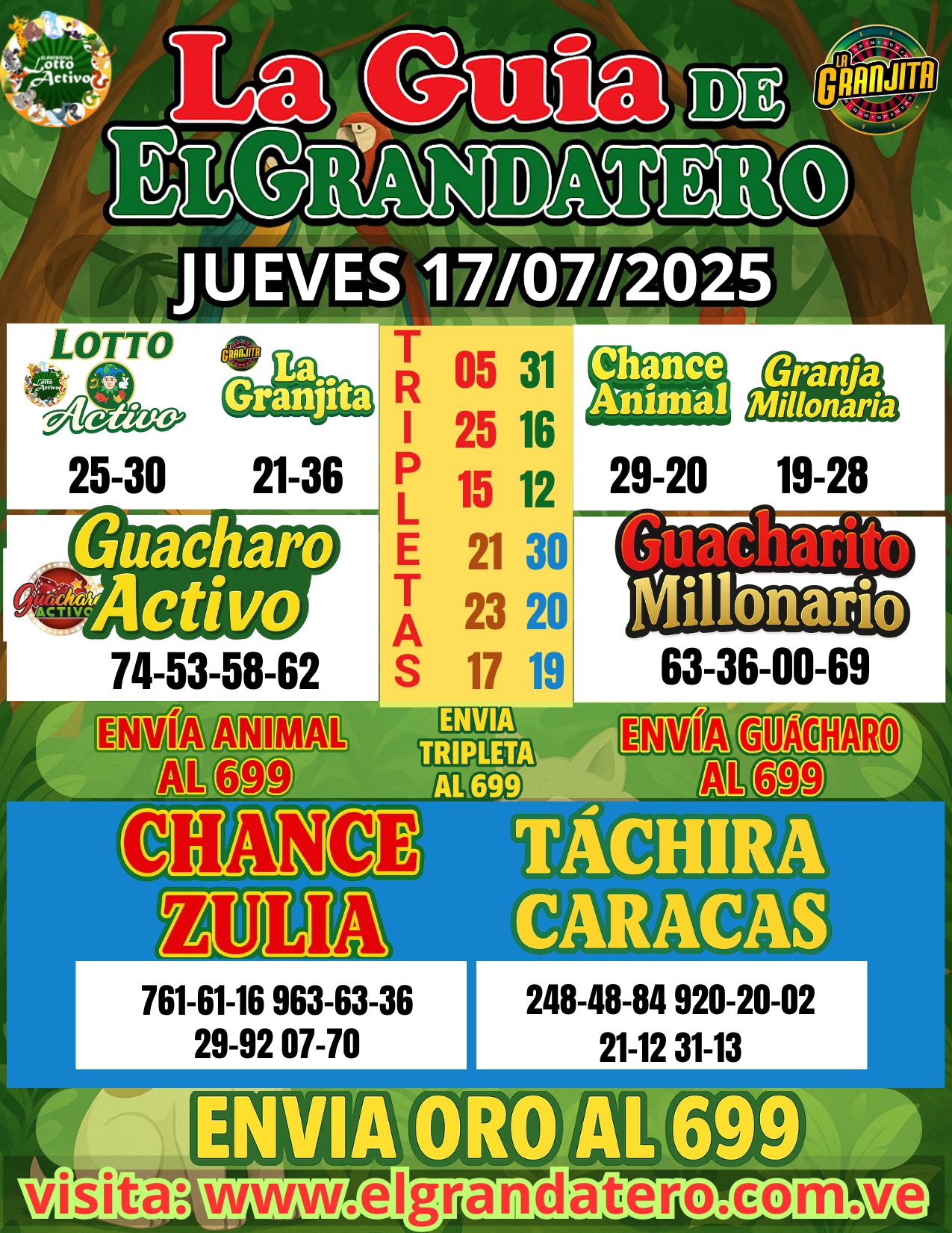 Descubre los mejores datos de loterías gratis para jugar en Chance, Zulia, Táchira y Caracas. Actualizamos nuestras proyecciones diariamente para ofrecerte la mayor precisión y efectividad en tus jugadas. Encuentra aquí datos de animalitos de hoy y resultados en tiempo real de Loto Activo, La Granjita, Chance Animal, Granja Millonaria, Guácharo Activo y Guacharito Millonario. Si buscas datos confiables para loterías venezolanas, estás en el lugar correcto. ¡Juega con estrategia, juega informado!
