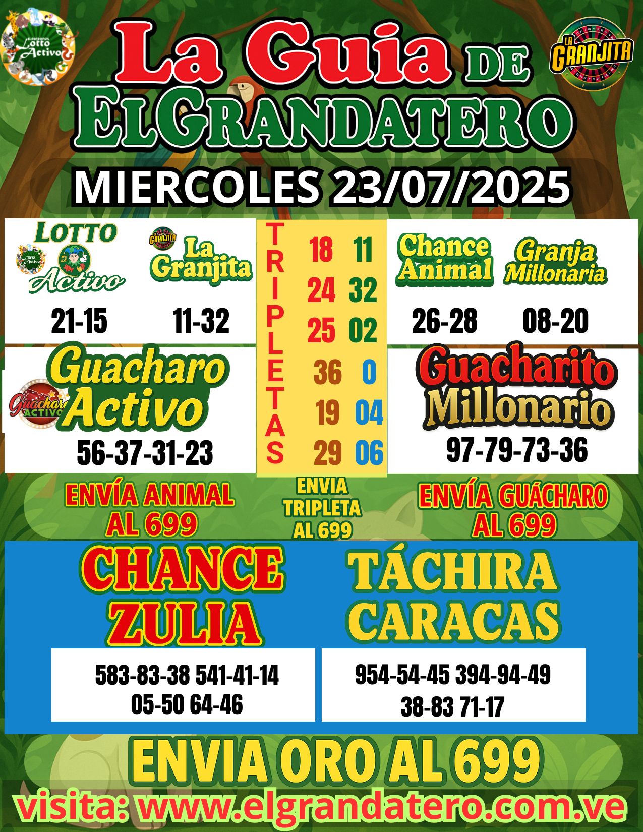 Descubre los mejores datos de loterías gratis para jugar en Chance, Zulia, Táchira y Caracas. Actualizamos nuestras proyecciones diariamente para ofrecerte la mayor precisión y efectividad en tus jugadas. Encuentra aquí datos de animalitos de hoy y resultados en tiempo real de Loto Activo, La Granjita, Chance Animal, Granja Millonaria, Guácharo Activo y Guacharito Millonario. Si buscas datos confiables para loterías venezolanas, estás en el lugar correcto. ¡Juega con estrategia, juega informado!