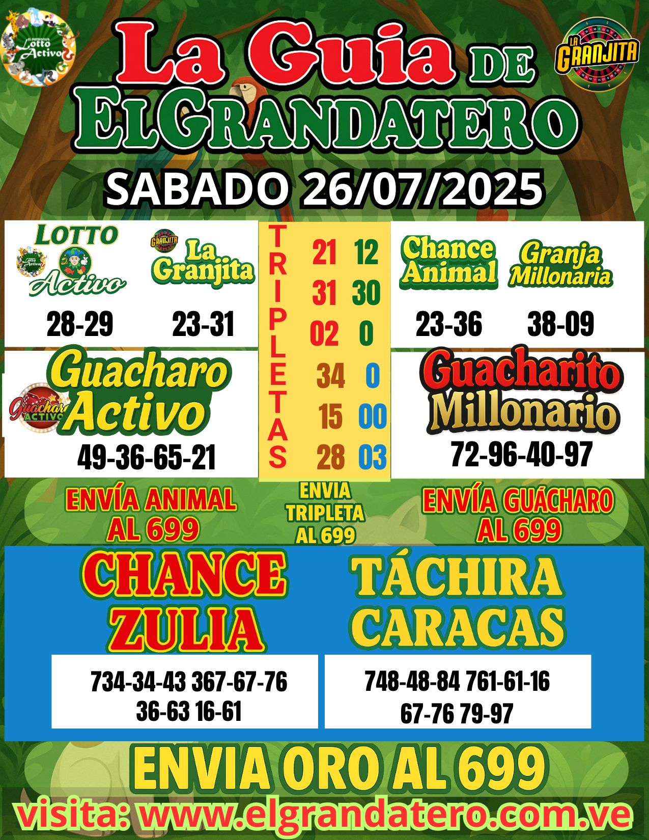 Descubre los mejores datos de loterías gratis para jugar en Chance, Zulia, Táchira y Caracas. Actualizamos nuestras proyecciones diariamente para ofrecerte la mayor precisión y efectividad en tus jugadas. Encuentra aquí datos de animalitos de hoy y resultados en tiempo real de Loto Activo, La Granjita, Chance Animal, Granja Millonaria, Guácharo Activo y Guacharito Millonario. Si buscas datos confiables para loterías venezolanas, estás en el lugar correcto. ¡Juega con estrategia, juega informado!