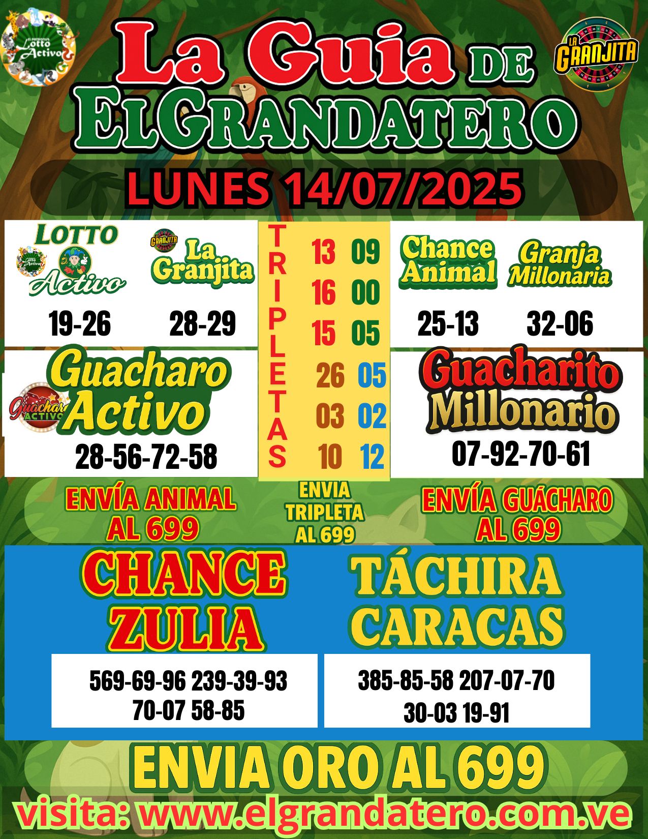 Descubre los mejores datos de loterías gratis para jugar en Chance, Zulia, Táchira y Caracas. Actualizamos nuestras proyecciones diariamente para ofrecerte la mayor precisión y efectividad en tus jugadas. Encuentra aquí datos de animalitos de hoy y resultados en tiempo real de Loto Activo, La Granjita, Chance Animal, Granja Millonaria, Guácharo Activo y Guacharito Millonario. Si buscas datos confiables para loterías venezolanas, estás en el lugar correcto. ¡Juega con estrategia, juega informado!